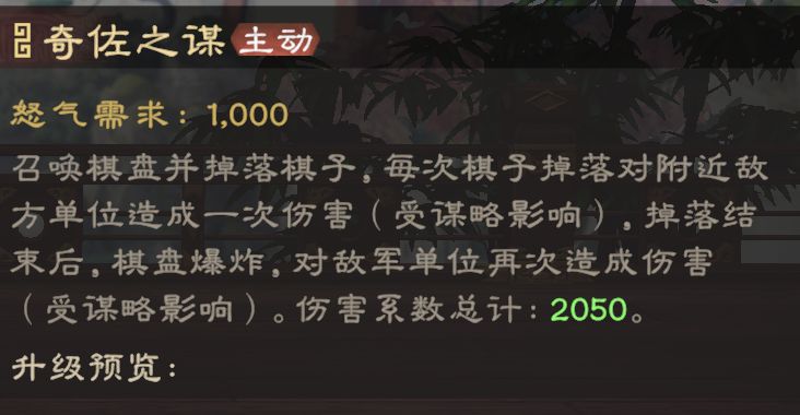 由于郭嘉谋略数值较高,再加上被动提供高额增伤,可通过奇佐之谋造成高额伤害。此技能范围广、伤害频率高,可集中打击某一区域的士兵。