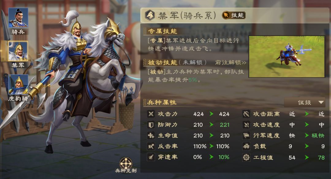 兵种:禁军(击飞、提升技能暴击)/虎豹骑(延长控制时间)