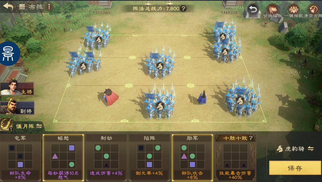 兵种可基于队伍体系灵活选择,技能系选择禁军,可额外提高暴击率,禁军搭配双龙阵提升暴击率,会有更显著的增伤收益;走控制路线,可选择虎豹骑,可延长控制时间,控制状态要衔接附加,才能起到足够的控场、减损作用。