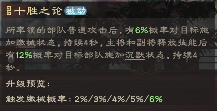 十胜之论在队伍普攻、释放技能时概率对目标施加缴械、沉默状态,可针对普攻、技能体系队伍,但控制状态要有衔接,才能发挥最佳的控场效果,所以郭嘉一般要再配一个打控制的武将。除了控制以外,郭嘉作为副将时可大幅提升部队技能伤害,队伍可通过技能打出高额爆发。