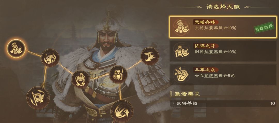 推荐路线:定韬兵略(抗震率)→百骑虎跃(骑兵提升攻击)→掌谋之阵(携带技能阵法,提升伤害)→焚舟破釜(提升技能伤害)→40级天赋(基于需求选择)→谋率深远(提升主动技能伤害)→50级天赋(基于需求选择)