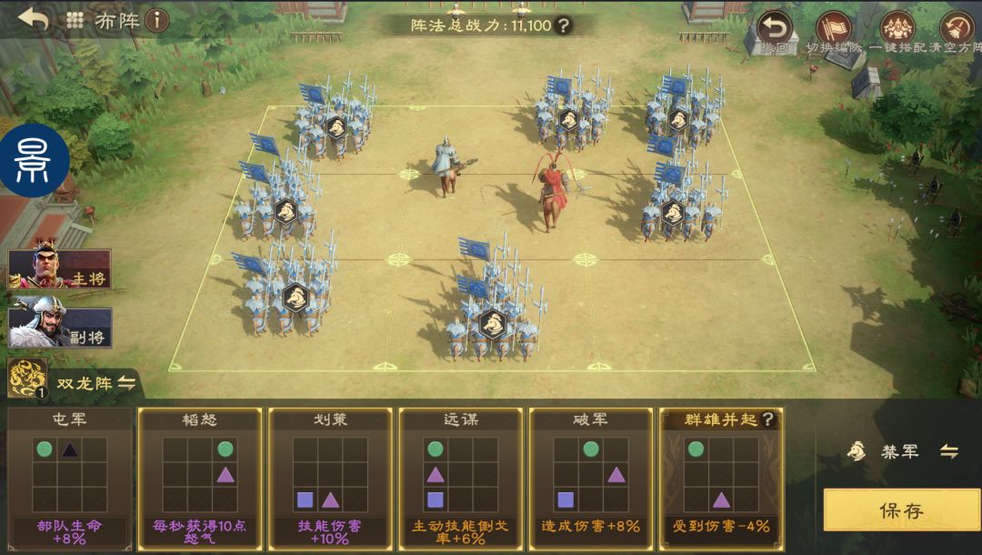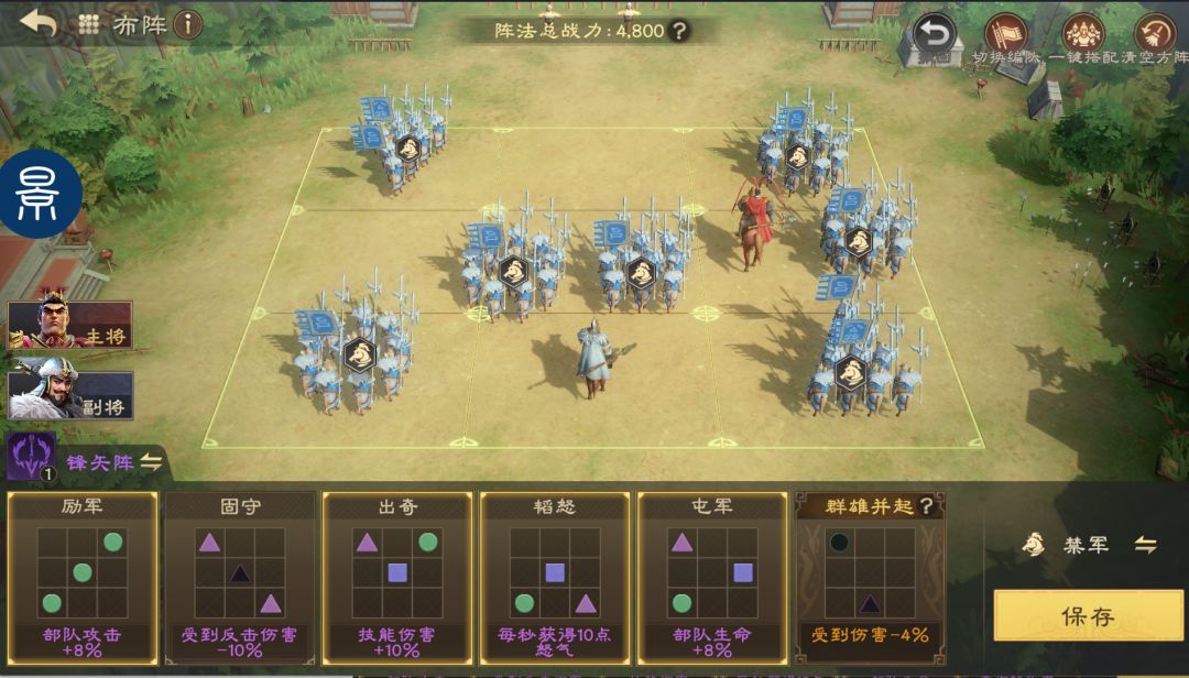 如果没有双龙阵,可用锋矢阵下位替换,锋矢阵也可提升队伍暴击率。在阵型方面,建议优先选择韬怒、励军、出奇、屯军。