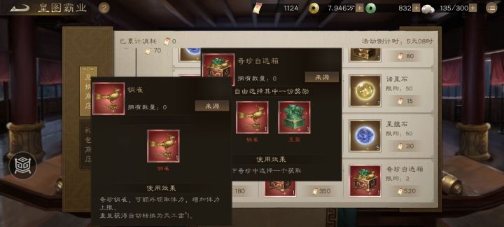 - 奇珍是永久性加成,长期游玩的话越早获取越受益,但需根据自身资源“量力而行”,一次活动拉满2个奇珍需要2040霸业券,需合理规划积累。