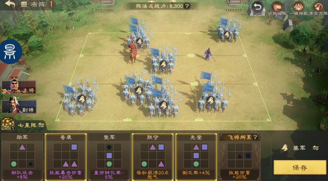 七星阵在部队普攻后概率提升主动技伤害,并且可通过“胆守”额外获得怒气,提高主动技释放频率,阵型可以优先选择胆守、奇袭、先登。