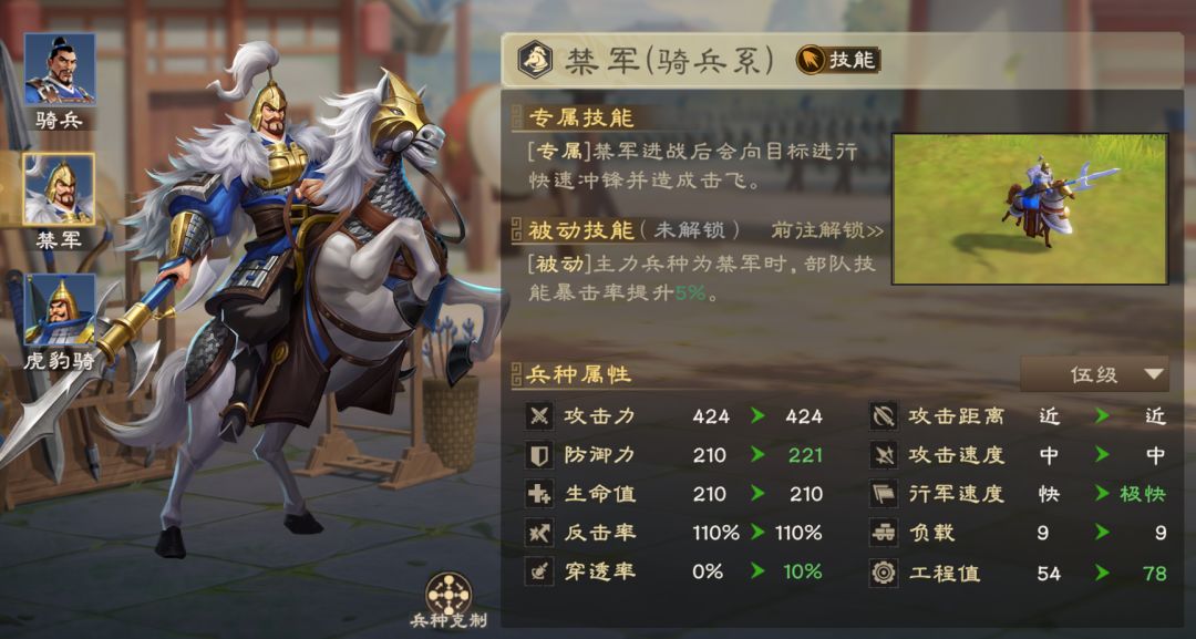 兵种:禁军(冲锋、提升暴击率)