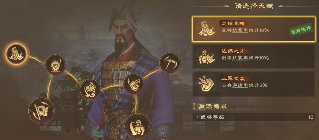 推荐路线:定韬兵略(抗震率)→万骑龙骧(骑兵提升生命值)→掌谋之阵(携带技能阵法,提升伤害)→焚舟破釜(提升技能伤害)→40级天赋(基于需求选择)→陷阵之志(提升技能伤害)→50级天赋(基于需求选择)