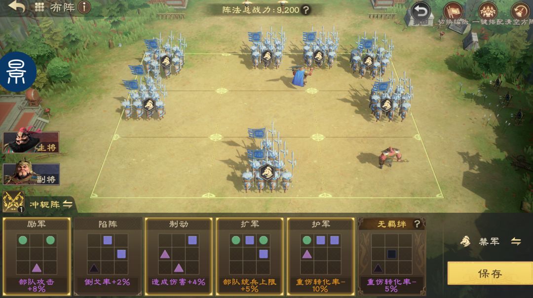 在构建反击体系队伍时可选择冲轭阵,此阵法可提升队伍的反击率、反击伤害,阵型可优先选择扩军、护军、制动、励军。