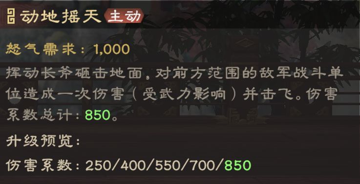 紫卡武将数值稍低,再加上主动技系数不高,只能作为副核使用。动地摇天有一段击飞,可略微降低战损。