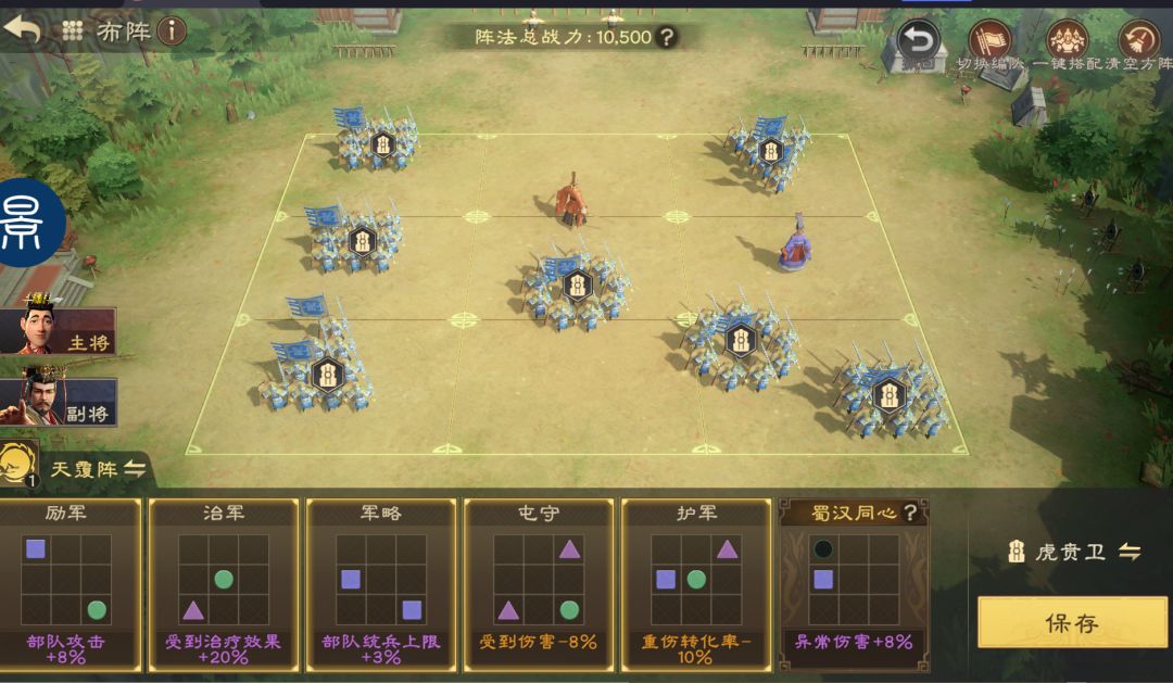 阵法主要基于主将进行选择,如果与刘备、许褚构建队伍,可选择天覆阵,释放技能后概率治疗自身部队(刘备、许褚均可提供治疗),维持队伍兵力健康。