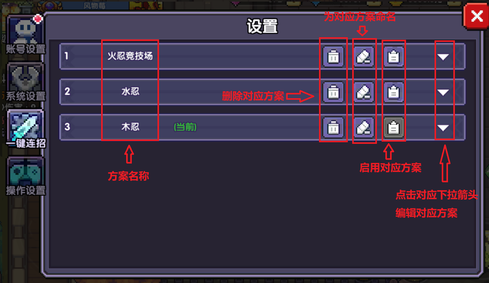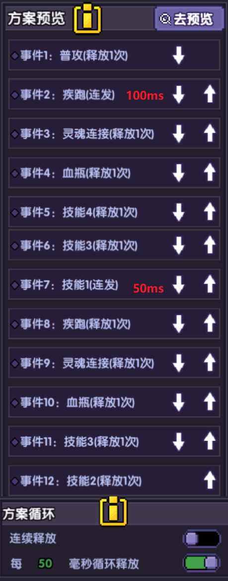 5.希望能一次启用多个连招,有些复杂操作并不仅仅依赖一套连招实现,同时启用多套连招也可以降低连招设置的复杂程度,即通过几个连招的规律释放来完成复杂操作。