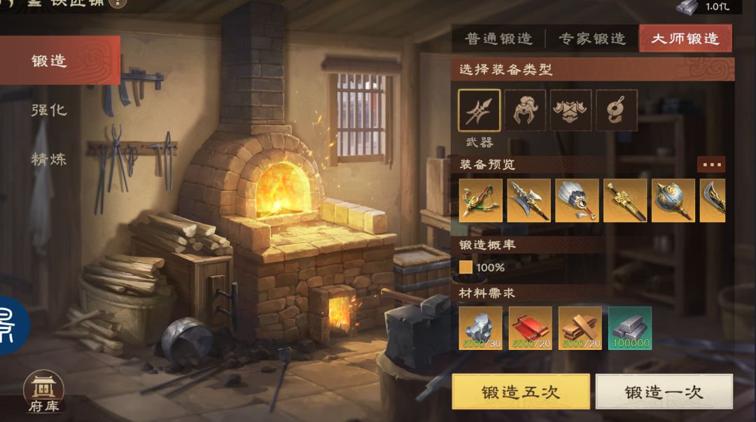 在霸府16级后可开放铁匠铺系统,这个时候装备系统也会随之开放。装备可基于武将定位进行选择,例如孙权是普攻流武将,可选择攻击力、所有伤害提升的装备。
