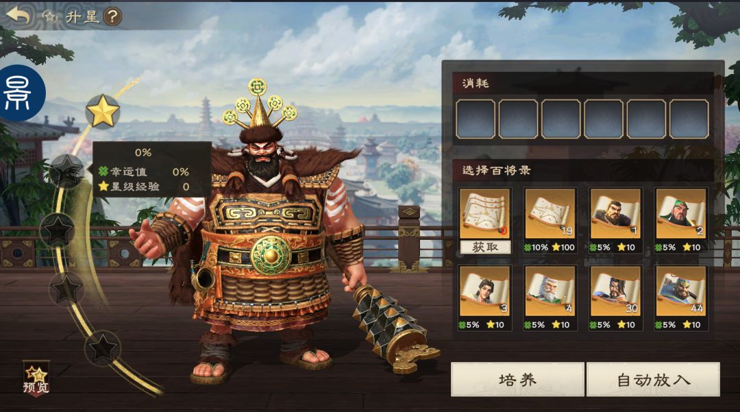 武将升星需要消耗对应品质的百将录,当星级经验达到100%,可提升到下一个星级。四叶草图标代表幸运值,代表“双倍经验值”转化的概率。升星有个小技巧,就是叠高幸运值,一次选择更高经验的百将录(主要通过招募获取,部分活动也可产出),一旦触发双倍,就可获取更多的星级经验。