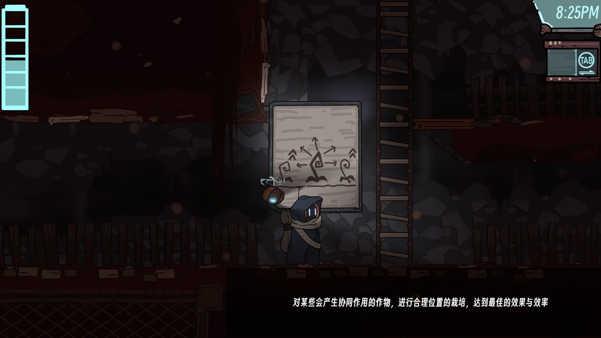 本作为一款剧情主线推动的废土风种田游戏,玩家可以在自己的地下农场种植作物合成实用的道具或者售卖获得金钱,游戏的画风偏向卡通,看起来很舒服。游戏中除了主线剧情任务之外还有一些支线剧情,玩家可以寻找场景内的npc触发并选择是否帮助他们,完成之后会获得奖励。