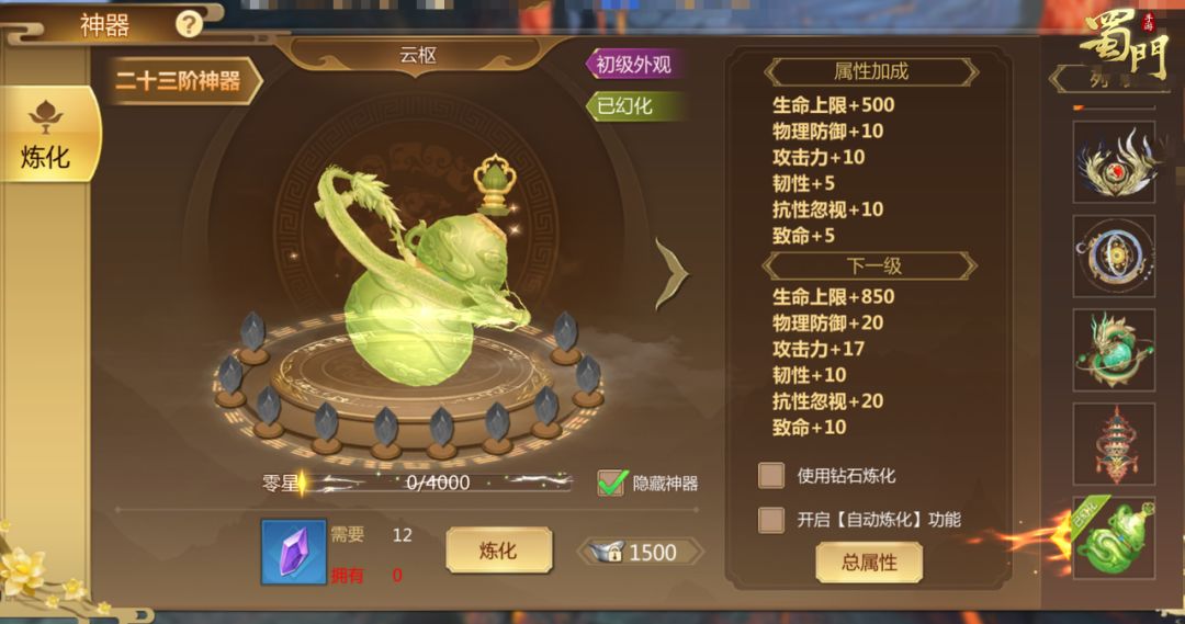 神器云枢可炼化的最高星级提升;淬炼等级上限最高可至98级;