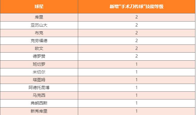 本次更新中,我们去除了传球属性需达到750才能触发快速传球动作的限制,同时,为以下球星新增了“手术刀传球”技能,希望能让使用不同球星的玩家们都可以享受通过传球组织串联全场的游戏体验。