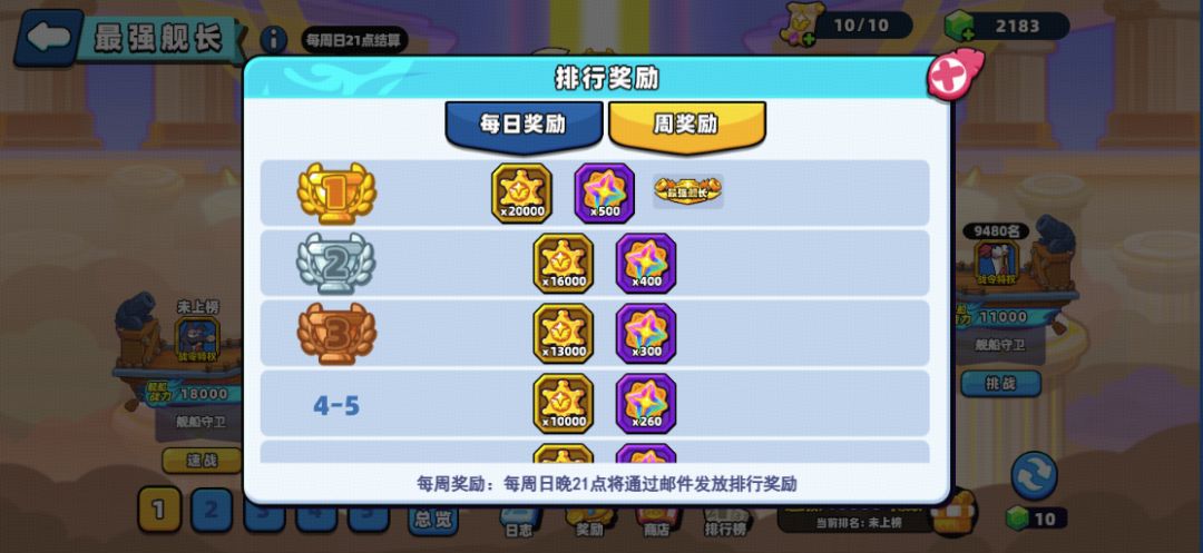 ● 【排名奖励】根据队长的排名进行排行(排名每周重置),在每日的21点根据排行结算日奖励,在每周日21点根据排行结算周奖励,奖励通过邮件发送。