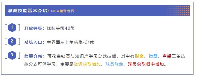 注意:球队等级达到40-150级时,每升1级可获取1知识点,一共可获得111点知识点。所有的总裁技能学习一共需要189点知识点,三条分支的小技能无法全部学习,正因如此,我们要在众多总裁技能中进行取舍,小篮接下来会从两个阶段给大家推荐总裁技能的搭配方案供参考。