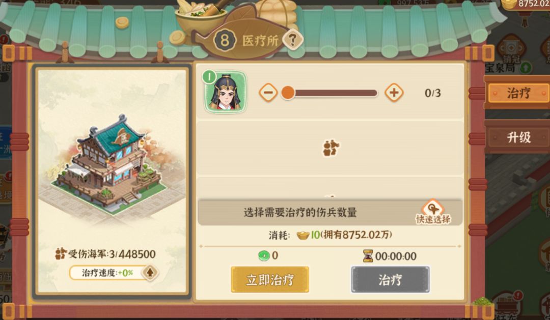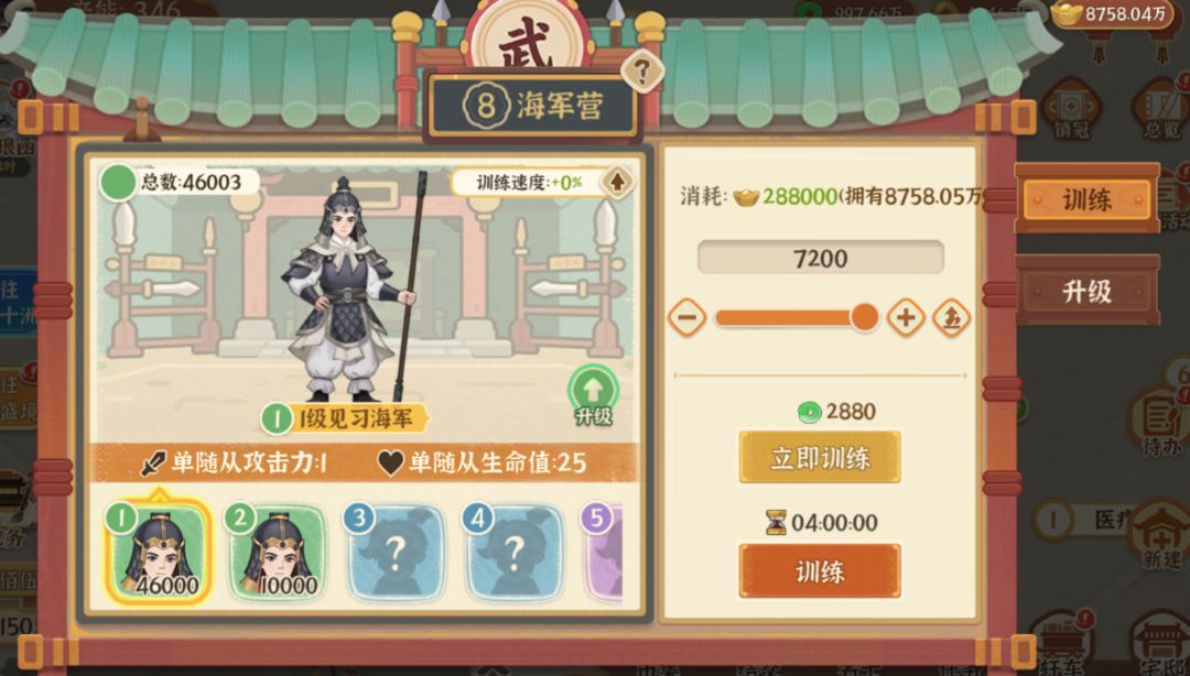 可训练海军、可升级海军,可使用加速道具加快训练。