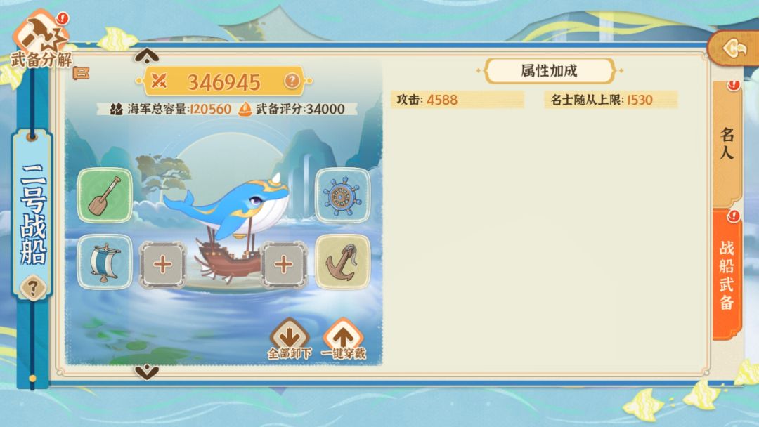 (1)提升名士携带海军数量、解锁战船、提升各建筑等级上限;