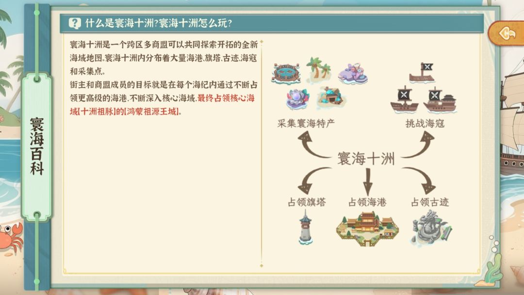 在「海纪文书」界面左下角,为「海纪百科」入口,各种图文解析,帮助街主快速了解寰海的设定与规则!