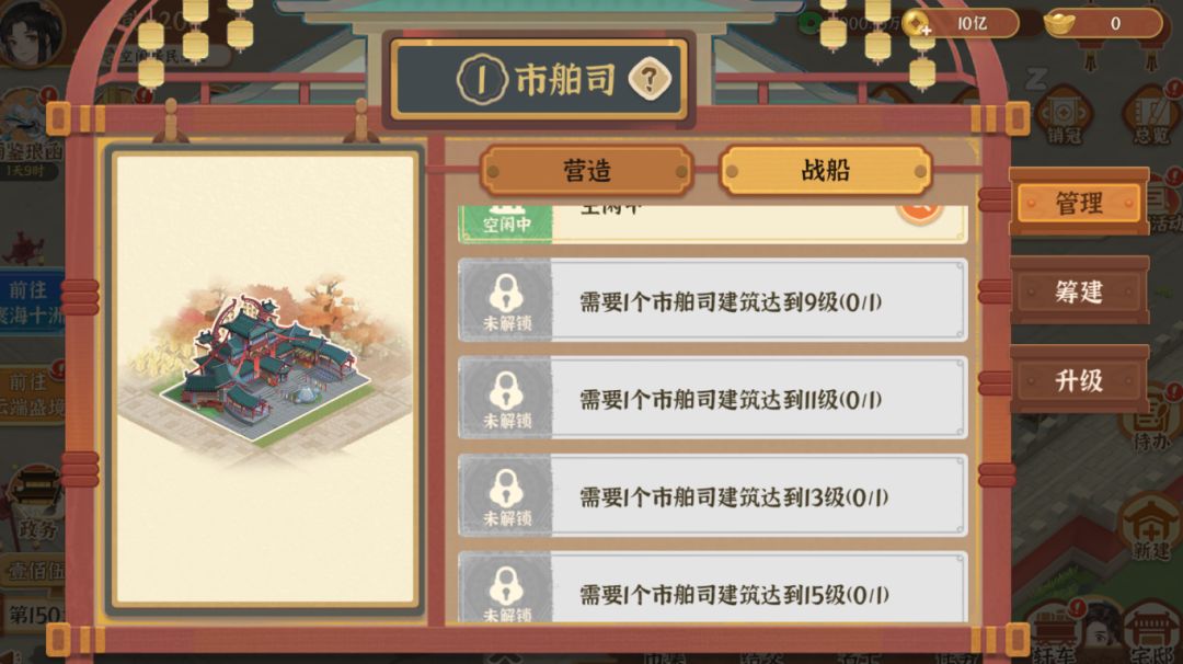 第一步:建设扬帆岛——建造【市舶司、宝泉局、海军营、医疗所】;