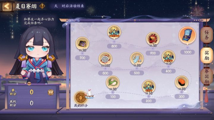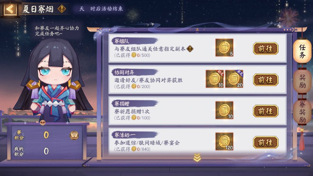 ※活动期间,阴阳师大人和寮友/好友齐心协力完成各类任务,可以获取相应的积分。部分组队任务可享受燃烧的胧车单人特权,单人也可完成。