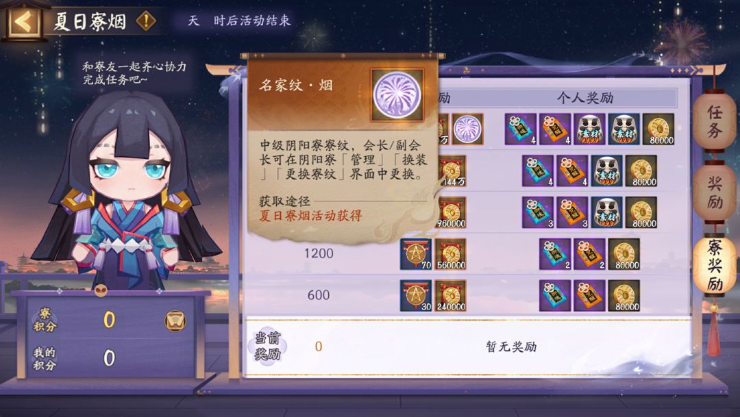 ※寮积分即是寮里所有成员个人积分的总和。活动结算时,将根据大人们所在阴阳寮的寮积分,解锁不同档次的寮奖励以及全新限定寮纹「名家纹·烟」。当个人积分达到200分以上时才可以领取寮相关奖励,解锁寮奖励需要的积分数值和活动开启时阴阳寮的等级、人数有关。
