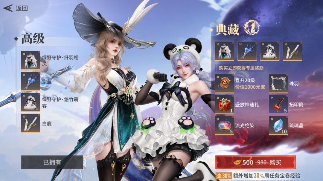如果想要升级更快还可以进阶为典藏通行证,直升20级,更有每周任务【隐族宝卷经验】额外提升30%。