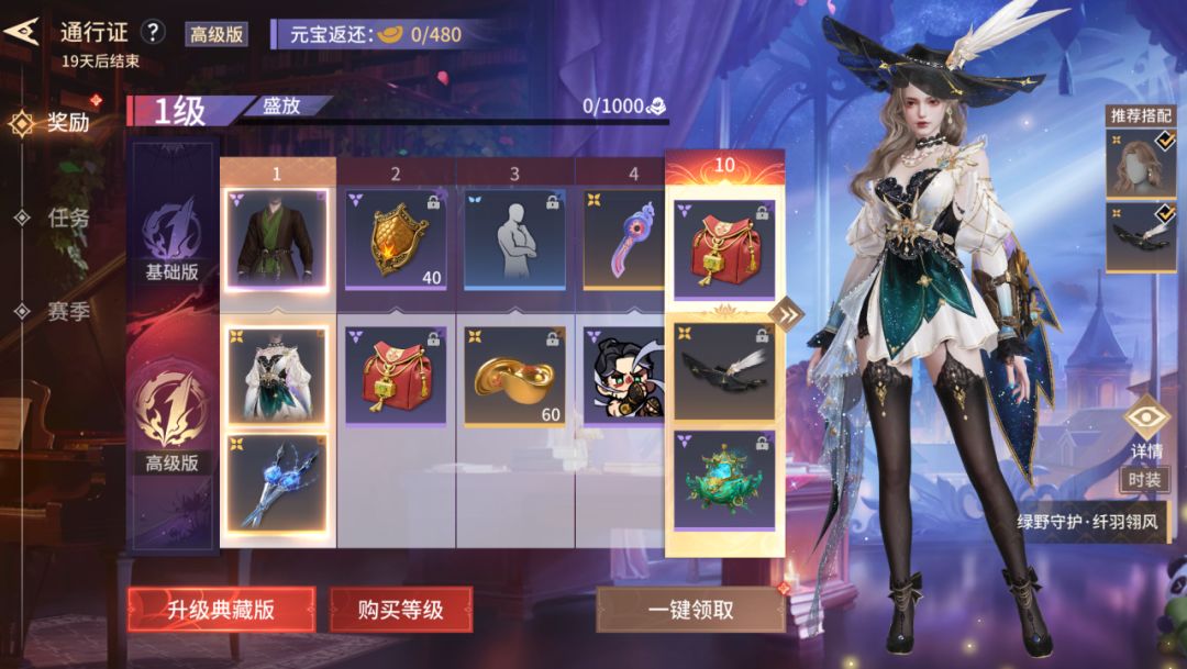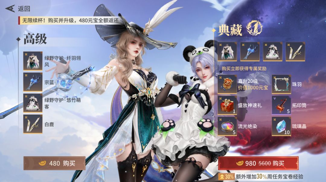480限时元宝开通高级通行证后不仅能直接获得席拉极品时装【绿野守护·纤羽翎风】,在升级等级后还会获得海量奖励,并且会返还480元宝!