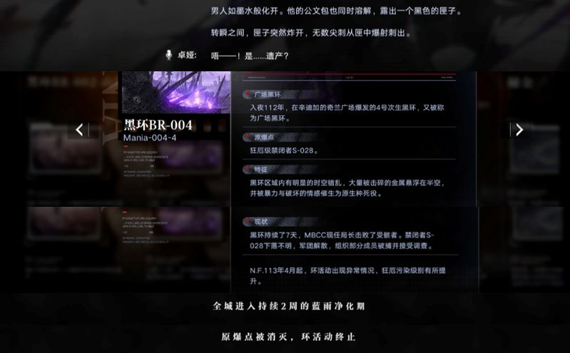 1、黑环持续了7天, MBCC 现任局长击败了受骸者,环活动终止, 全城进人持续2周的蓝雨净化期。
