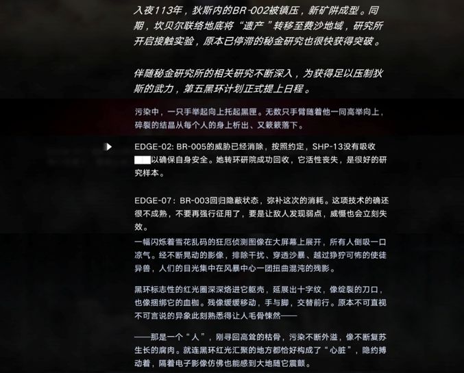 2、观测庭存在另一强大狂厄体进入BR-002消灭奇异点,半身失去活性遗留在矿井并呈现晶骸状态。