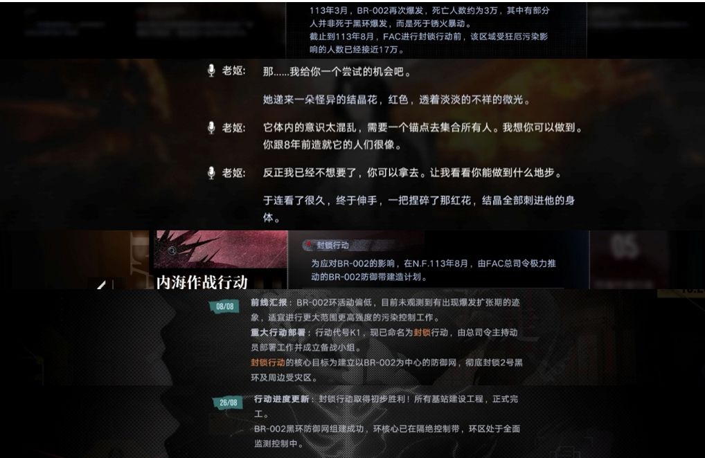 1、入夜115年8月8日,前线汇报,BR -002环活动偏低,目前未观测到有出现爆发扩张期的迹象,适宜进行更大范围更高强度的污染控制工作,进行重大行动部署:行动代号K1,现已命名为封锁行动,由总司令主持动员部署工作并成立备战小组。 封锁行动的核心目标为建立以 BR -002为中心的防御网,彻底封锁2号黑环及周边受灾区。