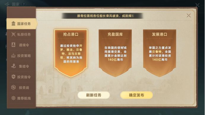 2)玩法心得:在此三种选项中”充盈国库”是完成时间最长的,我也建议将充盈国库当做国家任务的唯一选项,如果起手三个任务未包含”充盈国库”,请使用”刷新任务”选项直至刷新出”充盈国库”的国家任务。因为其他两项国家任务完成时间太短,容易让很多“早睡晚起”的玩家错过参与国家任务的机会。且以港口投资为手段,尤其是大投资战前夕,很容易空耗国力。国家投资策略也需要国库资金支持,充盈国库也会为后续国家发展给予支持。(国家投资策略会在后文中详细解释)国家任意顾问可以在周二和周五零点发布国家任务。