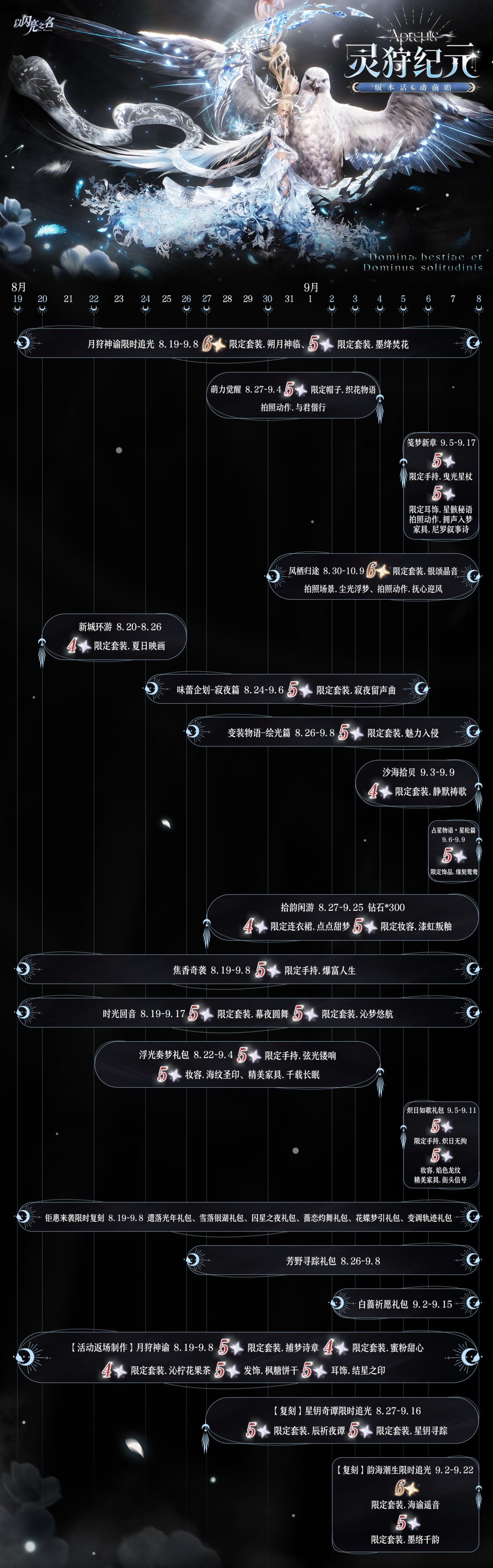 8月19日10:00,限定追光活动【月狩神谕】上线!全新六星套装及SSR羁绊限时登场!该追光活动每登场25次内必得新限定六星套装部件(直至集齐限定六星套装)。集齐限定六星套装还可激活专属出场动作(摄像机镜头动态动作)【永夜引弓】,并可在拍照-动态动作里使用。此外,【追光·月狩分解】商店也将同期限时开启,通过分解该限时追光活动内的服饰,可获得限定五星时装部件【尼罗幽光】、【轻羽素笺】、【雪团萌潮】及拍照背景【繁花回廊】、限定家具、头像装扮、聊天装扮、拍照道具、月狩风向标、心念之蝶、知之钥、金币等材料道具!