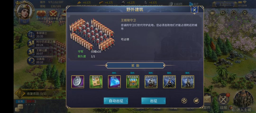 需要注意的是,风车、石头城堡是打下就立马获得奖励,而行商营地和战争学院、猛兽巢穴这些则需要占领4个小时才可以有奖励。