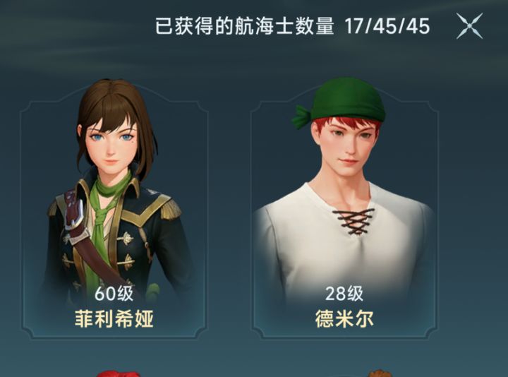 17代表我拥有的,第二个45代表列表里有的,最后一个45代表目前一共有多少航海士