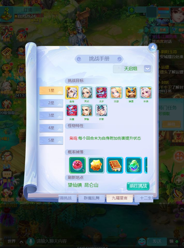 1.星官挑战根据人物等级将划分为3个等级段,并在指定地图刷新挑战怪物:
