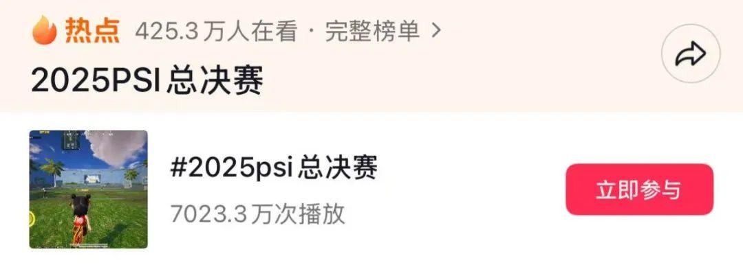 次截至8月13日,决赛虽已落幕,但热度依旧不减,抖音#2025年PSI总决赛话题依然在热点榜上,播放量超过7000万。《和平精英》PSI不仅在大秀的风潮中稳稳立足,展示出独特的竞技魅力,更拿出自己长久坚持所打造出的硬实力,成为目前公认的将电竞属性与娱乐内容融合得最好的主播赛事。