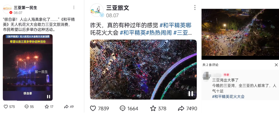 在这段时间,我们也可以看到“凤凰岛花火”与和平精英主题的“无人机大秀”频繁出现在社交平台的热议话题中,一方面由全国顶尖的蔡国庆工作室花火团队打造的无人机花火大秀,将无人机与花火表演设计得浑然天成,另一方面不仅是单纯的天空视觉景观,整个三亚在地面楼宇方面的同步配置,比如海天盛筵楼幕上对PSI等内容的配合支持,也可以看作是三亚整座城市对活动的重视与支持。