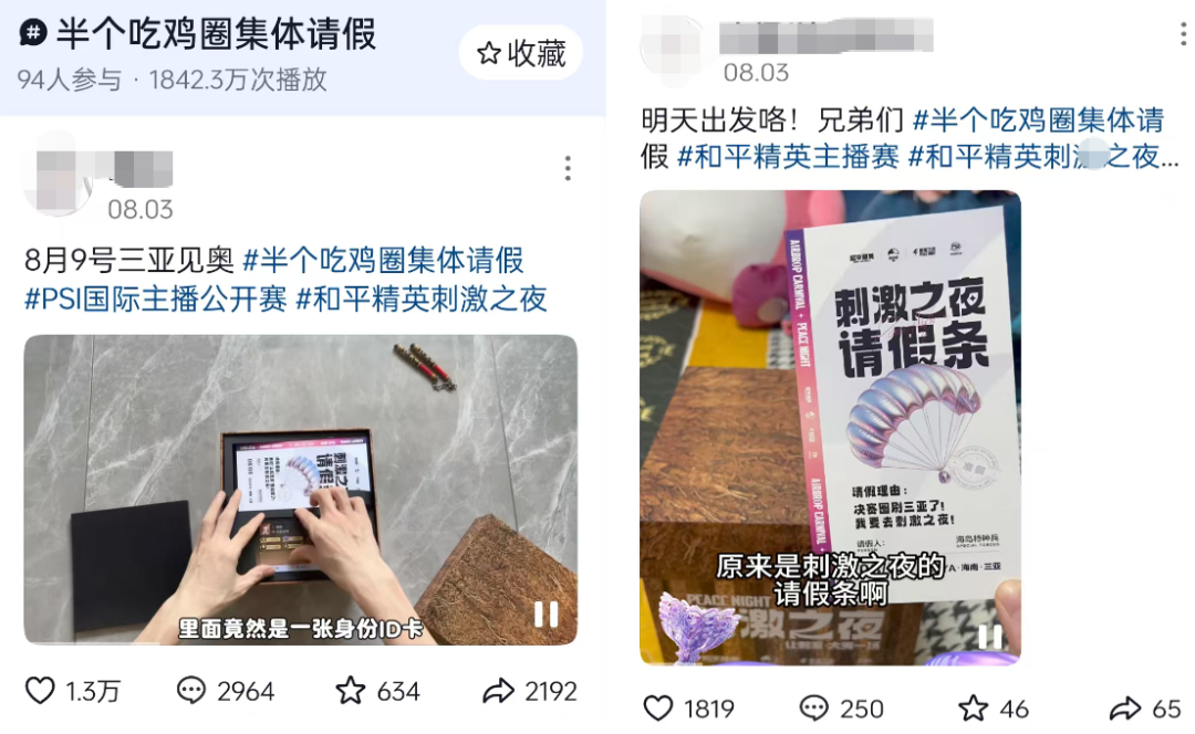 PSI赛事到今年已经连续举办了五届,对比以往,它再度实现了新突破,让大秀这个“和平春晚”更加华丽。在决赛前,主播收到了“请假条”式的邀请函,百位人气主播发布开箱邀约视频,集体“请假”,这种官方帮主播给玩家请假的形式也让主播的粉丝直呼“头回见”。不管是抖音还是快手,话题量和人气度都居高不下,为今年的PSI赛事开了一个好头。