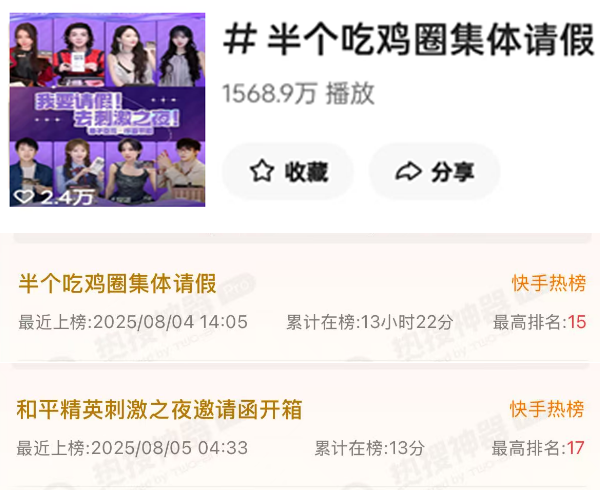 快手#半个吃鸡圈集体请假 话题冲上热榜第15名;#和平精英刺激之夜邀请函开箱 话题冲上热榜第17名