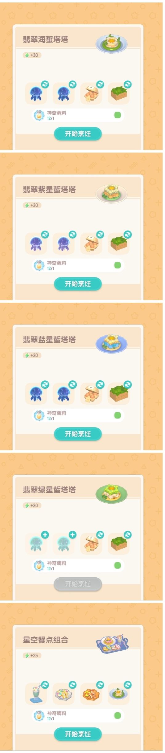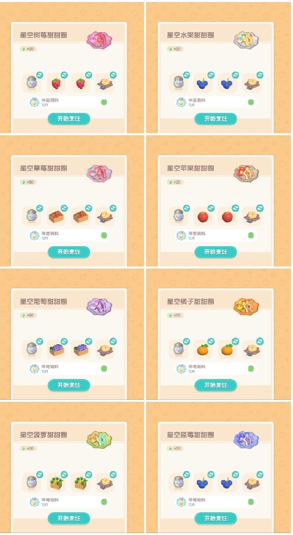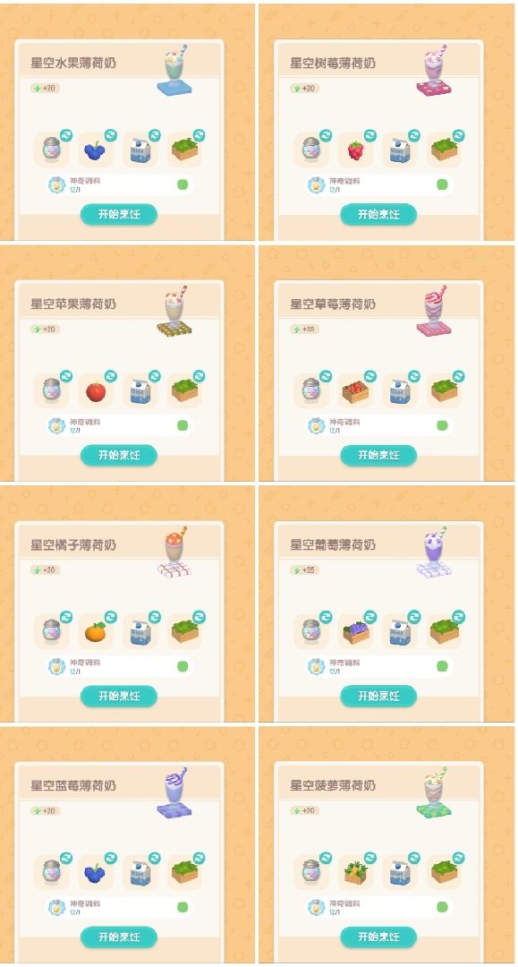 食用星星粉和食谱找马西莫获取,没有的食谱需要自己替换食材获取。