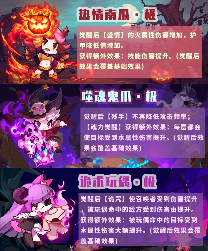 热情南瓜、噬魂幽爪、诡术玩偶将在版本更新后开放觉醒功能;