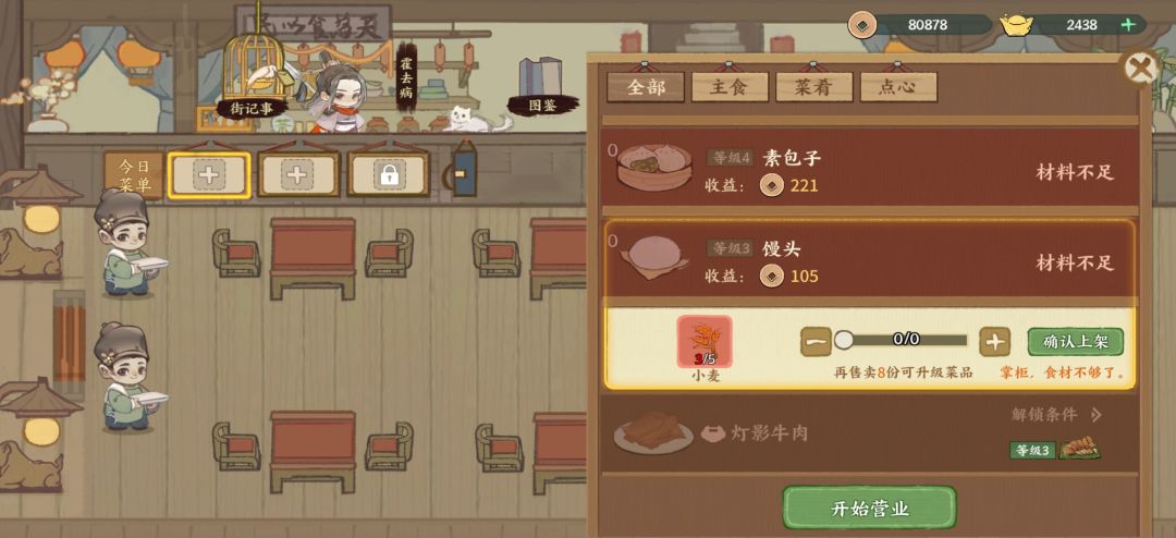 这里有个点大家注意一下,不要一下子全部上架,如果能升级菜品,先上架一部分让菜品升级,升完级再上架剩下的,这样收益会更高。