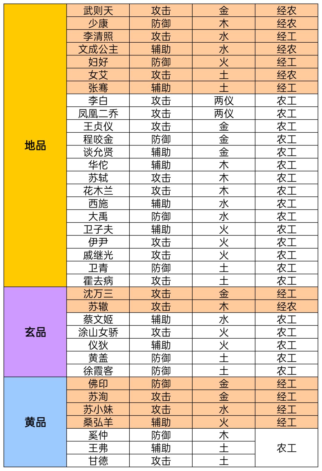 名士入驻方面,经济类名士有:所有天品及下表橙底名士。