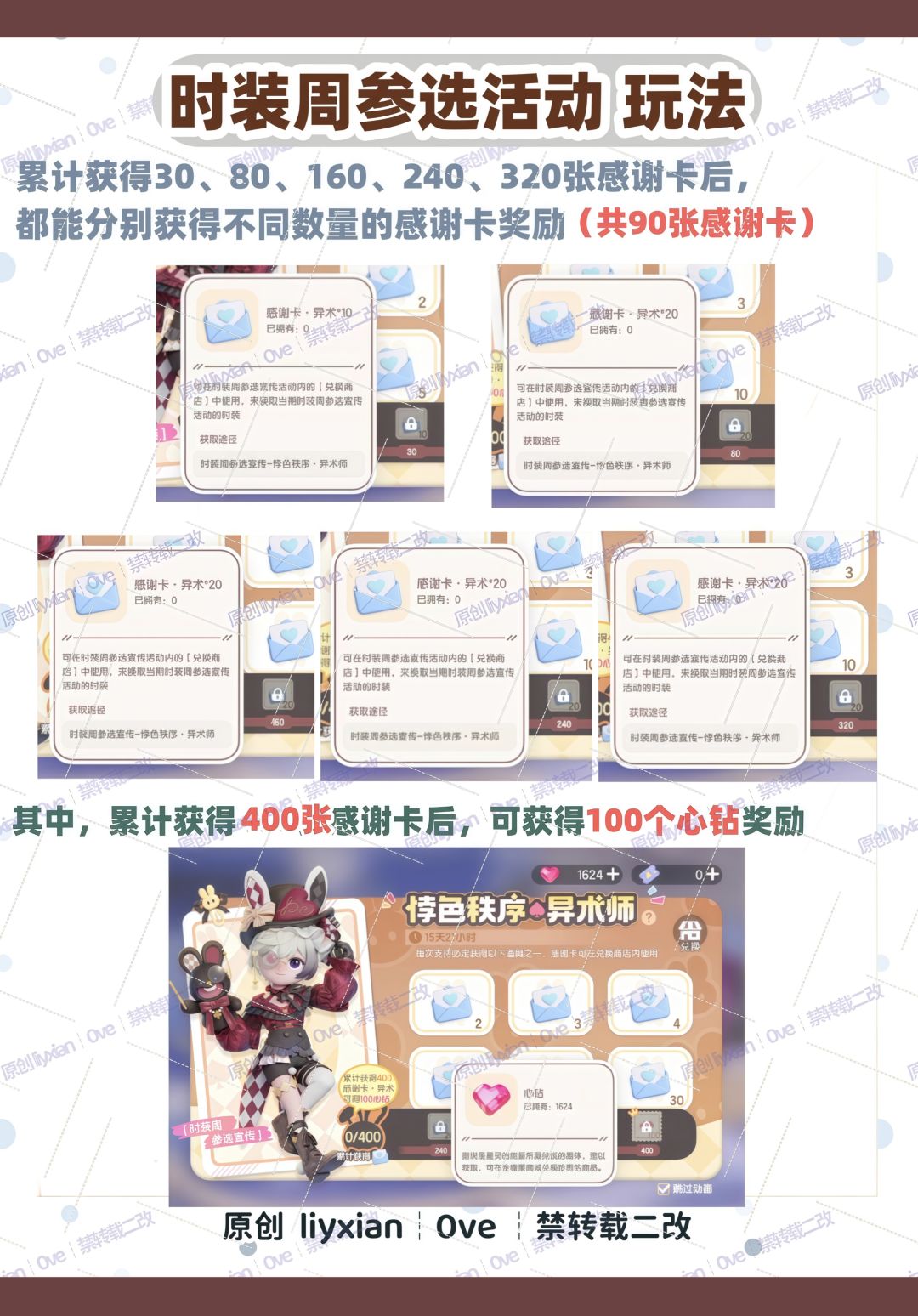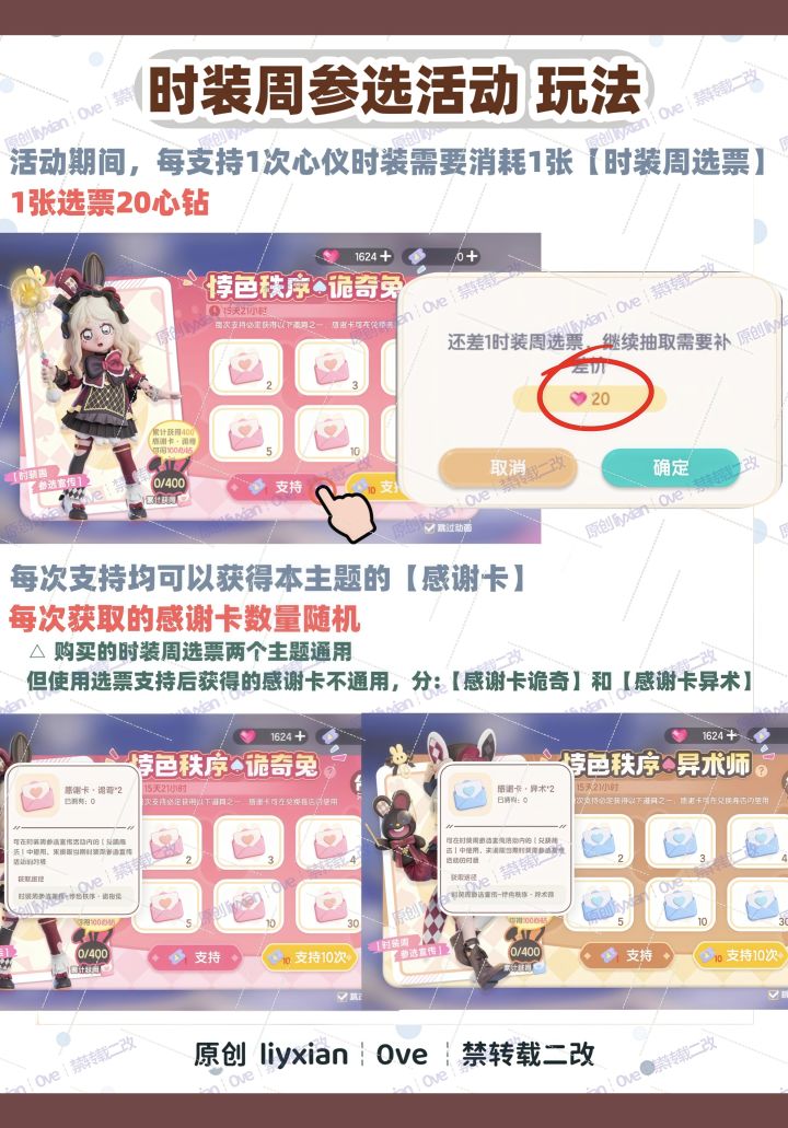 活动期间,每支持1次心仪时装,需要消耗1张【时装周选票】,1张选票20心钻。