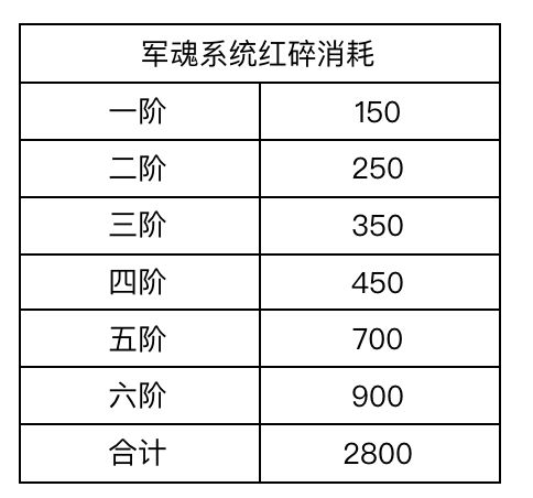 军魂系统总计6阶,每一阶解锁后均从0级开始升级。每一阶满级后可进阶至下一阶继续升级。具体消耗总结如下: