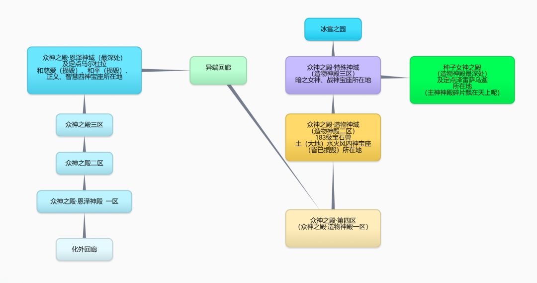 另附上神殿这一片的大致路线,恩泽那里的四神我忘了具体是哪四个,但是智慧神和正义神的宝座是完整的