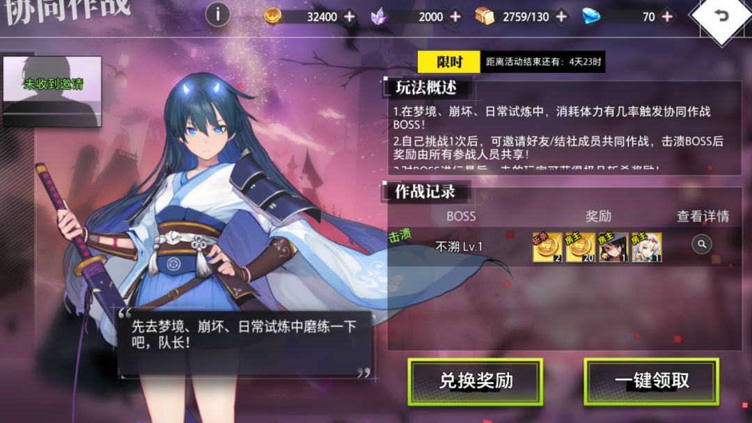 本次活动时间为8月2日至8月6日,玩家在「梦境」「崩坏」「日常试炼」中消耗体力时,有概率触发协同作战BOSS「不溯」。玩家同时仅能触发1个BOSS,boss出现后需注意协同boss规则: