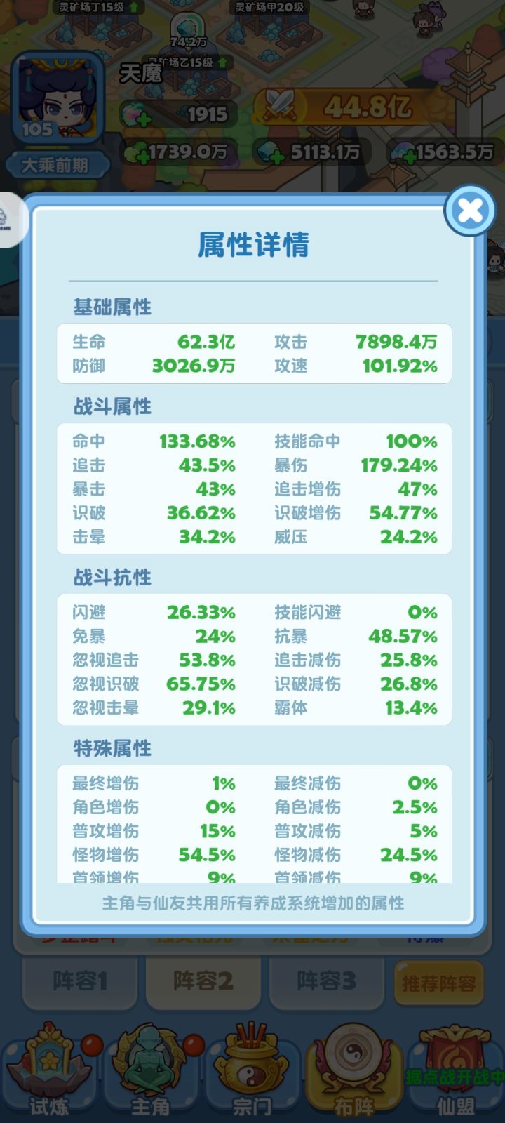 最后拓展一下,把每个加属性系统的属性都合在一起就是角色面板的属性,然后上阵的每一个仙友包括主角面板属性是一样,由每个仙友、角色的技能倍率计算输出伤害。综上所述提战力就是要提升角色属性面板和角色技能倍率。提战力的氪金点就在这两个大板块